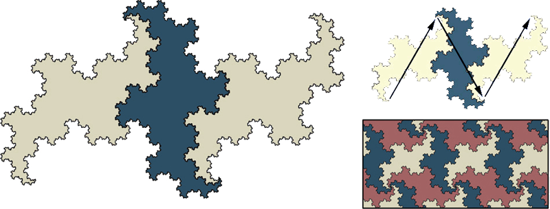 | Famed computer scientist Donald Knuth is said to have first discovered the Ter-Dragon. Unlike the HH Dragon, the Ter-Dragon has point-symmetry: its tail looks like its head...which looks like its tail. Notice also that three copies of the Ter Dragon can be combined to make a larger one. But no surprise there, right? This fractal curve just oozes with three-ness. The box at the lower-right shows how the Ter-Dragon can tile the plane. |