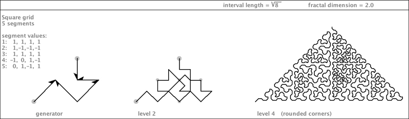 As a general rule, you can consider segments of length root2 to count as two (remember that we square the lengths when calculating fractal dimension). So in this case, two one-length segments and three segments of root2 - when squared - add up to 8: the family number. The root8 family is quite versatile. First let's look at some curves that fill a right triangle. Two of them are shown below. Like the last curve I showed you, the generators for these curves each have 5 segments, three with a length of root2. |