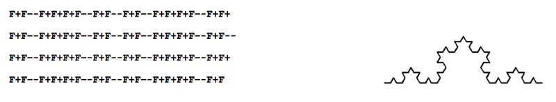 In 1968, a botanist by the name of Astrid Lindenmayer devised a way of describing the growth of plants. This has come to be known as "L-systems". They are recursive "string-rewriting systems", used to model branching forms, embryological development, and many self-similar fractal geometries. Consider the following L-system description used to draw the Koch curve: |